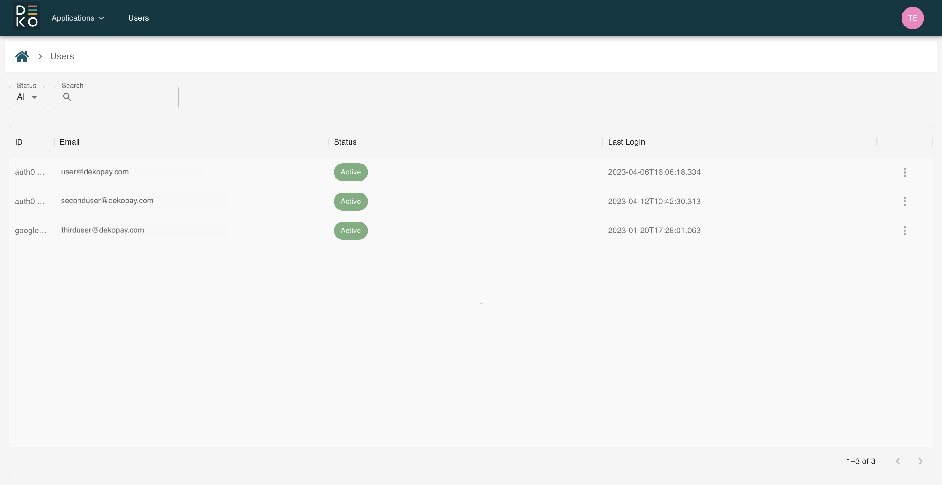 By accessing the User Management section in the Deko Dashboard, it is possible to view all of your users. You can search for specific users, as well as order by and filter by email, status and last login.