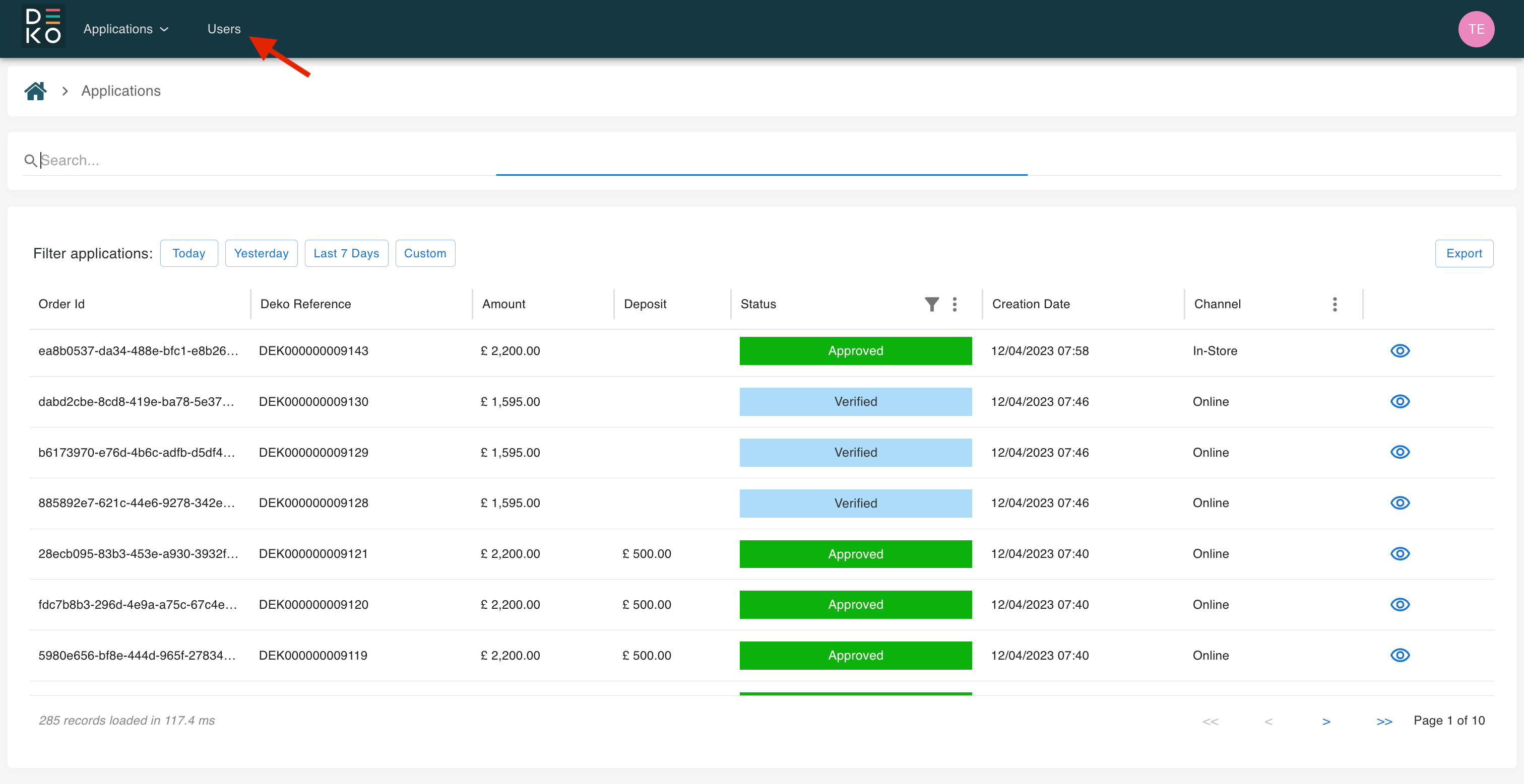 The User Management section can be found in the top navigation in the Deko Dashboard.